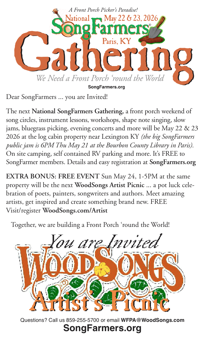 The 11th National SongFarmers Gathering & Music Picnic coming May 22 & 23, 2026 in America’s front porch community of Paris, KY (near Lexington) Bring your instrument, your voice, your songs and have a front porch picking time with SongFarmers!